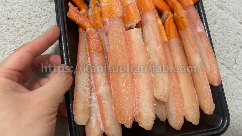 カニはしっかり冷凍されていて、霜や氷焼けはほとんどありません。通販のカニは品質が心配でしたが、第一印象はかなり良かったです。